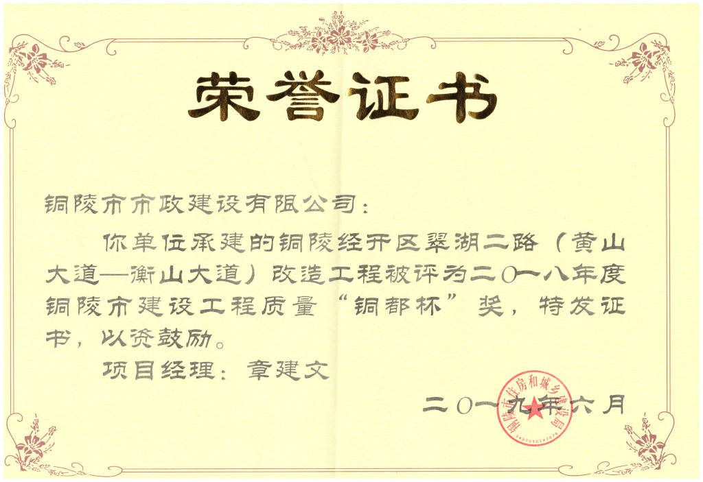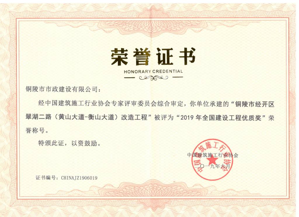 2019.6銅陵經(jīng)開區(qū)翠湖二路(黃山大道-衡山大道)改造工程優(yōu)良工程