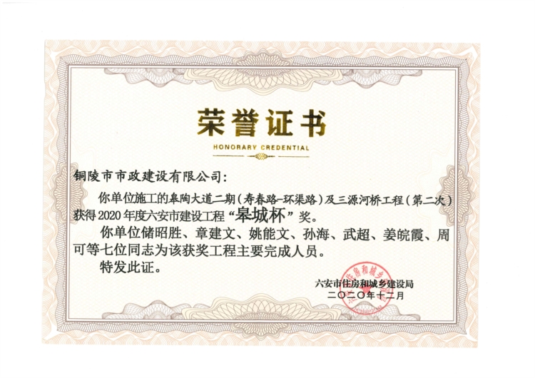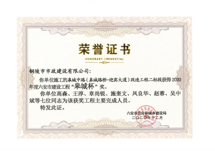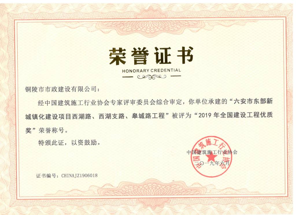 六安市東部新城鎮(zhèn)化建設(shè)項目西湖路、西湖支路、皋城路工程全國建設(shè)工程優(yōu)質(zhì)獎