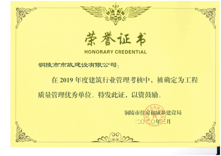 2019年度市工程質(zhì)量管理優(yōu)秀單位