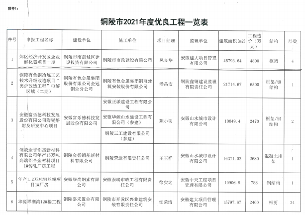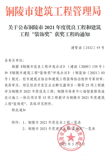 熱烈祝賀我司承建的郊區經濟開發區企業孵化器項目一期(項目經理:鳳良華)榮獲銅陵市2021年度 優良工程。