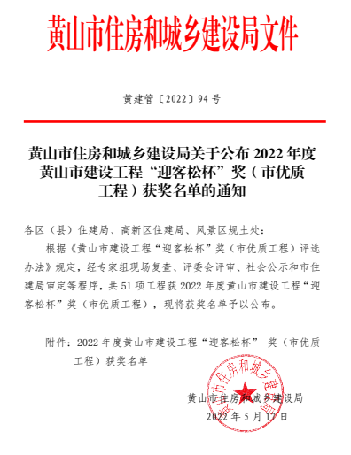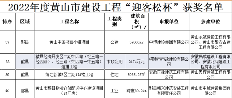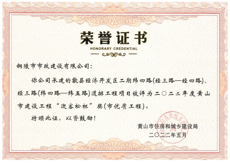 熱烈祝賀我司承建的歙縣經(jīng)濟(jì)開發(fā)區(qū)二期緯四路(經(jīng)三路—經(jīng)四路)、經(jīng)三路(緯四路—緯五路)道排工程(項(xiàng)目經(jīng)理:易曉云)榮獲2022年黃山市建設(shè)工程“迎客松杯” 獎(jiǎng)。