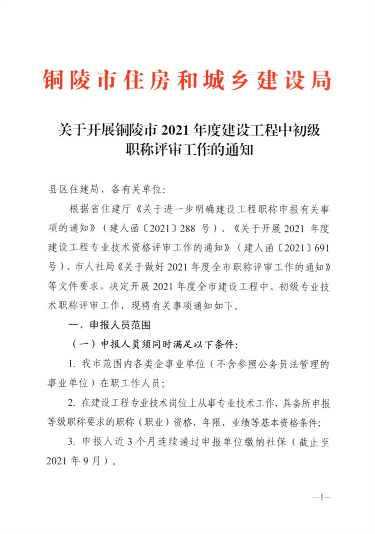 關(guān)于開展銅陵市2021年度建設(shè)工程中初級職稱評審工作的通知