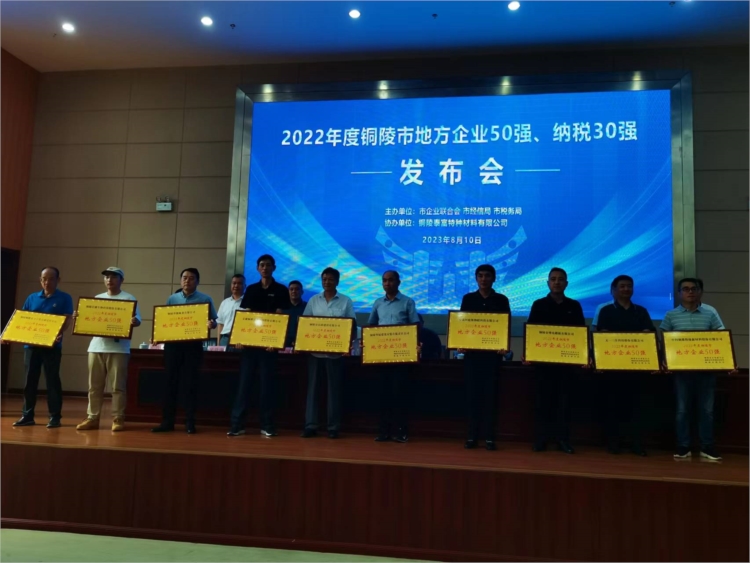 2023年8月10日下午,銅陵地方企業(yè)50強、納稅30強的發(fā)布會在銅陵泰富特種材料有限公司召開,此次發(fā)布會由銅陵市企業(yè)聯(lián)合會、銅陵市經(jīng)濟和信息化局、銅陵市稅務(wù)局共同組織, 熱烈祝賀我公司榮獲“2022年度銅陵市地方企業(yè)50強”稱號。